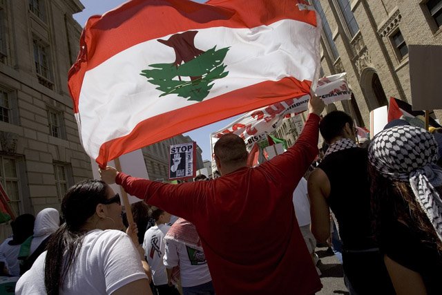 Pro-Lebanon protesters show the peace sign as they gather at the Civic Center after the march.